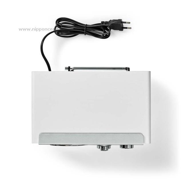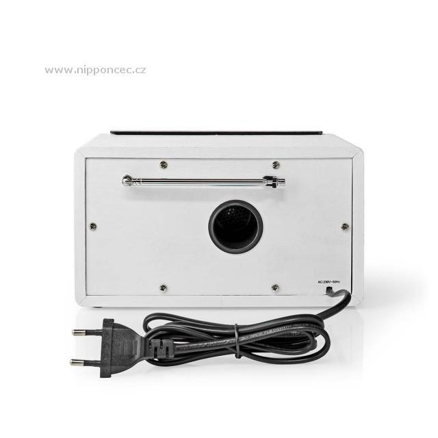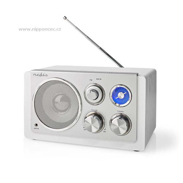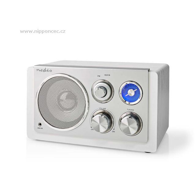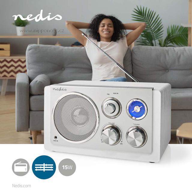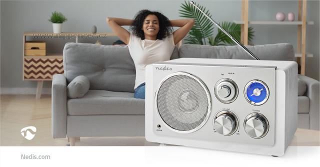 Retro FM rádio Nedis® RDFM5110WT pro poslech oblíbených rozhlasových stanic, které zároveň umožňuje propojením přes AUX kabel poslouchat vlastní seznamy skladeb nebo oblíbené podcasty přes chytrý telefon, tablet nebo přehrávač MP3. Rádio není velké a dobře se přenáší, vhodné i na chatu, kempování atd.