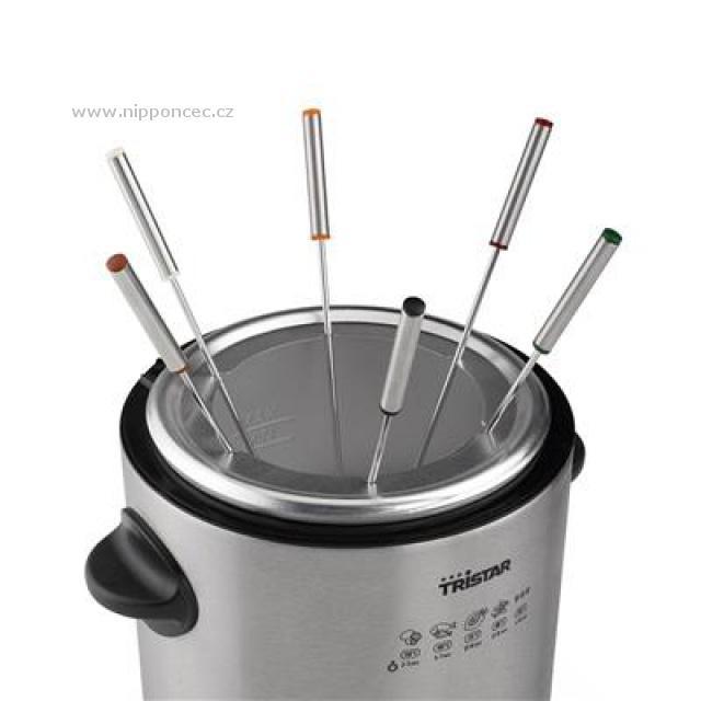 Máte v kuchyni málo místa? Pak Elektrické fondue FO-1102 od firmy Tristar nabízí skvělé řešení. Ukrývá v sobě totiž fondue pro 6 osob a zároveň fritézu. Je vhodný pro přípravu klasického sýrového, čokoládového nebo masového fondue či pro fritování potravin. Je vybaven velkým ovládacím kotoučem a tepelně izolovanými rukojeťmi. Pro jednodušší ovládání je na krytu fondue natištěný přehled teplot pro přípravu jednotlivých potravin. Nerezová nádoba na fondue o objemu 1l je pro snadné čistění snímatelná a je možné ji umýt v myčce nádobí. Navíc, pokud si přejete uchovat olej v nádobě, pak stačí přikrýt odnímatelným víkem, které je dodáváno spolu s fondue. Součástí balení je 6 fondue vidliček s barevně rozlišenými konci pro jejich jednoduché rozlišení