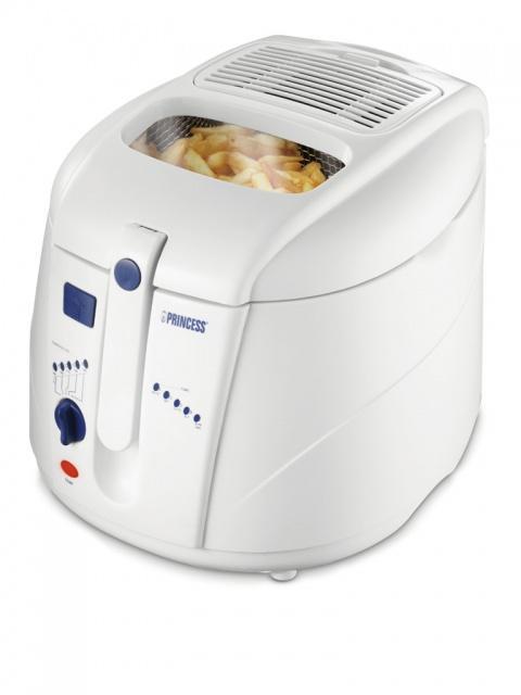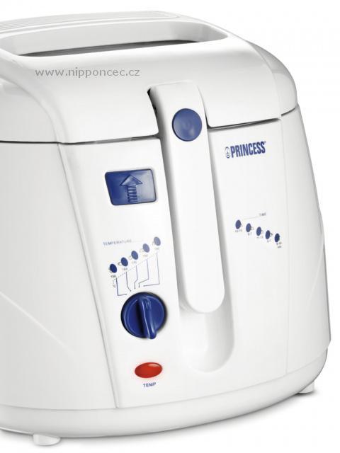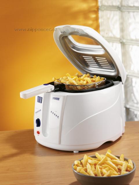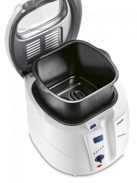 Fritéza Princess v bílé barvě. Fritéza má výjimatelnou nádobu s nepřipékavým povrchem na bázi teflonu,