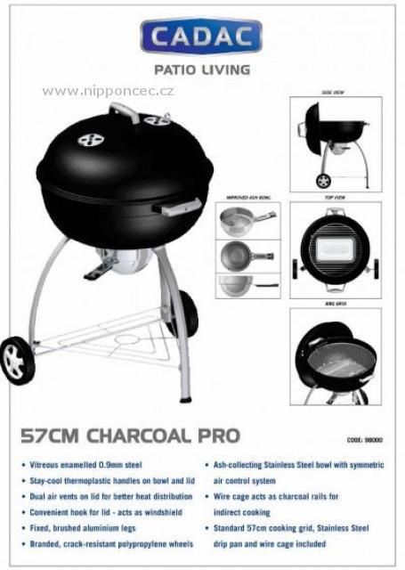 Gril Cadac Charcoal Pro 57 kulový gril na dřevěné uhlí, který vám umožní přímé i nepřímé grilování. Gril je vybaven víkem s teploměrem a duálním systémem průduchů, ve spodní části je nerezová nádoba na popel. Držadla a víko grilu jsou z termoplastu, kvůli ochráně proti popálení. Gril je vybaven závěsnou lištou na grilovací náčiní, kvalitní výrobek - tloušťka plechu 0,9 mm.