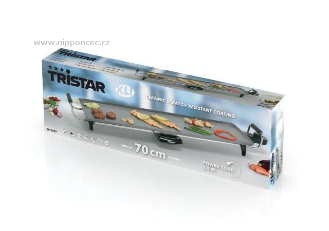 Rozměrná grilovací ploténka TRISTAR BP 2987 má keramický odolný nátěr proti poškrábání, odolný i proti připékání potravin, a XXL grilovací ploténku o velikosti 70x23 cm a odnímatelný termostat s nastavitelnou teplotou do 250°C a světelnou kontrolkou a integrovaný odkapávač tuku. Díky nepřilnavému povrchu je údržba snadná, gril zpravidla krátce po použití ještě vlažný postačí otřít papírovou utěrkou.