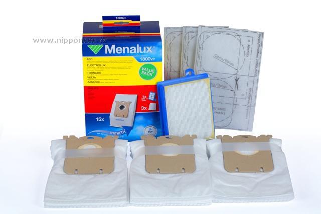 Electrolux (Menalux 1800VP) 15 sáčků s-bag ®, HEPA filtr H13 omýv, 3 filtry Originální sadu příslušenství k vysavačům vyrábí společnost Electrolux pod svou značkou Menalux. Sada obsahuje 15 sáčků s-bag z netkané textilie, HEPA filtr omývatelný H13 a 3 mikrofiltry. Sada originálních sáčků s náhradním omývatelným HEPA filtrem je kompatibilní se značením HEPA filtru Electrolux EFH12, EFH12W, EFH13W, AEG AFS1W, Philips FC8031, FC8038 a značením sáčků s-bag Electrolux E200, E200B, E200M, E201B, E201M, E201S, E202, E203, E203S, E206B, E212B, Menalux 1800, Menalux 1800MP, Philips FC8019/01, Philips FC8021/03, Philips FC8022/04, Philips FC8023/04, Swirl E82, Swirl PH86...Sada je určena určeny pro vysavače produktových řad: AEG-ELECTROLUX: Clario, Clario 2, Classic Silence, ErgoSpace, Excelio, Essensio, JetMaxx, Maximus, Oxygen, Oxy3system, UltraSilencer, UltraOne, Viva Control, Viva Quickstop....