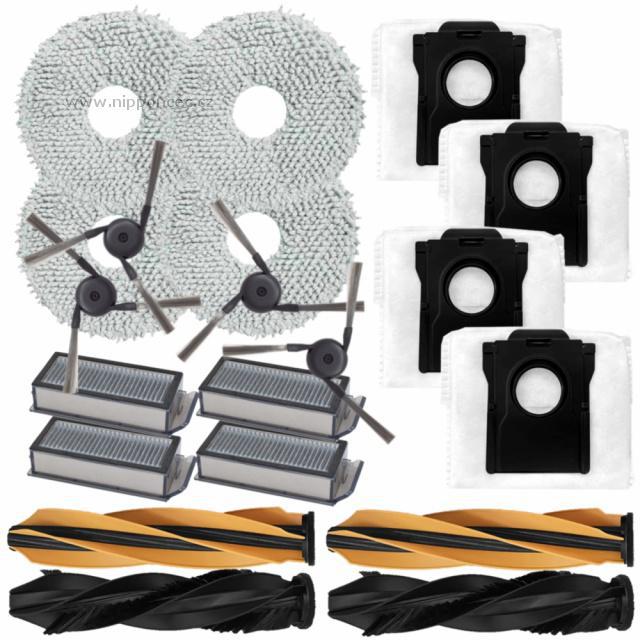 HEPA filtry, mopy, sáčky a kartáče pro vysavače Dreame X50 Ultra, S40 Enhanced 20ks Neoriginální sada příslušenství obsahuje 4x mop, 4x boční kartáč, 4x HEPA filtr, 4x sáček do vysavače, a 4 hlavní kartáče. Sada je kompatibilní pro robotické vysavače DREAME X50 Ultra, DREAME X50 Ultra Complete, DREAME L50 Ultra Complete, DREAME S40 Enhanced. Sada je vhodná i pro DREAME X50 Master, s výhradou sáčků, ty kompatibilní nejsou. Při výměně filtrů, kartáčů i dalšího příslušenství postupujte dle návodu k obsluze vašeho vysavače a dodržujte četnost výměny jednotlivých dílů, v něm uvedenou. Výměna kartáčů je doporučena mezi 6 až 12ti měsíci - v závislosti na jejich aktuálním opotřebení. Výměna HEPA filtru je doporučena 1x ročně, nebo dříve, je-li poškozený. Sáčky jsou vyrobeny z netkané textilie. Mopy jsou pratelné v automatické pračce.