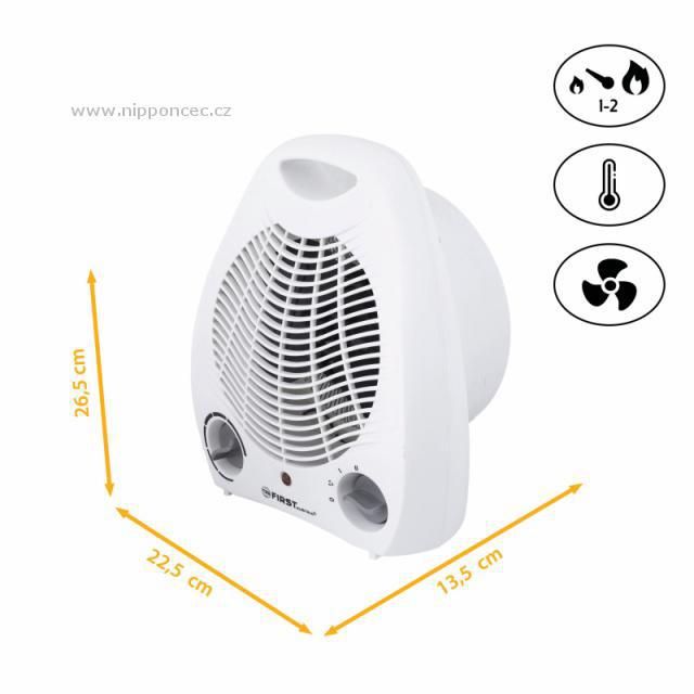 Horkovzdušný ventilátor First Austria FA-5568-2 s výkonem 2000 W je skvělou volbou pro rychlé přitopení v místností. Nabízí dva stupně výkonu, díky kterým snadno přizpůsobíte intenzitu tepla aktuálním potřebám. Ventilátor je vybaven i bezpečnostní pojistkou proti přehřátí. Díky kompaktním rozměrům (22,5 x 13,5 x 26 cm) a praktickému madlu je manipulace i skladování velmi jednoduché – ventilátor snadno umístíte kamkoli je potřeba.