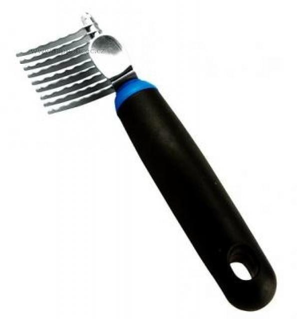 Kvalitní trimovací hřeben s pogumovanou rukojetí pro snadný úchop, s devíti ocelovými nerez zuby délky 4 cm, a celkovou délkou 16 cm.