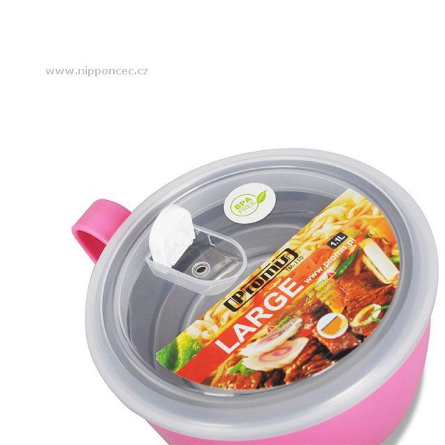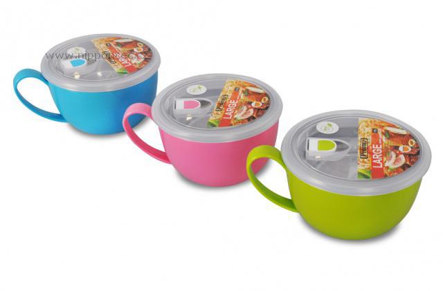 Veselá přepravka na jídlo v podobě hrnku s velkým uchem o objemu 1,1 litru je vhodná na teplé i studené potraviny, které můžete konzumovat přímo z nádoby. Vnější část je z vysoce kvalitního plastu, určeného pro styk s potravinami. Vnitřní část je vyrobena z nerezové oceli. Transparentní víčko je opatřeno ventilem pro vyrovnání tlaku a 100% těsněním pro snadný transport.