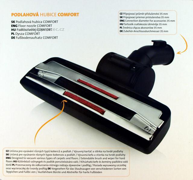 Podlahová hubice ETA Comfort k vysavačům s průměrem připojení 35 mm Přepínací hubice ETA pro vysavače s průměrem trubic 35 mm, je vhodná na koberce i tvrdé podlahy - dlažbu, lino, kachle, mramor, plovoucí podlahy. Na parkety a pevné podlahy slouží vysouvací kartáč, který chrání podlahy před poškrábáním a pro koberce je určena skluzná nerezová část s lapačem nečistot (vlasy a jiné). Nechybí parkovací klip pro snadné uskladnění vysavače.
