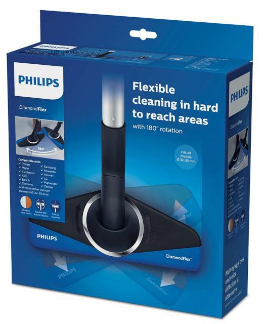 Hubice Philips Diamond Flex pro vysavače Philips AutoClean, Performer, PowerLife, PowerPro Active, PowerPro Compact, Ultimate... Flexibilní čistění v těžko dostupných místech - to je hlavní atribut této nové hubice na tvrdé podlahy od společnosti Philips. Jde jedinečný nástroj, který se otáčí okolo předmětů o 180 stupňů a dosáhne i do úzkých prostor, rohů ... Díky rotačnímu mechanismu a paměťové funkci se automaticky vrátí do výchozí polohy. Hubice DiamondFlex je vybavena postranními vzuchovými kanály pro zlepšení výkonu podél stěn a nábytku. Je určena pro pevné podlahy - tedy parkety, lino, dlažbu, kachličky.... Univerzální hubice - je vybavena adaptérem pro připojení 32/35 mm kruh - jednoduše vzato - lze ji použít k mnoha různým vysavačům dalších výrobců - MIELE, ELECTROLUX, AEG, BOSCH, SIEMENS, SAMSUNG, ROWENTA, HOOVER, LG, PANASONIC se shodným připojením.