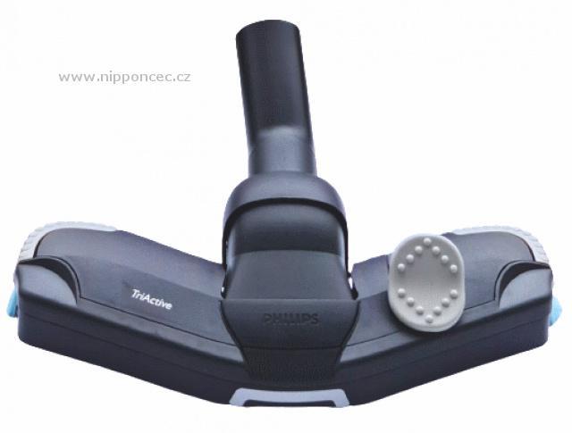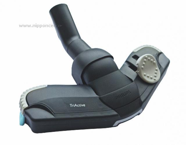 Podlahová hubice Philips Tri-Active pro vysavače Philips s průměrem trubky 35 mm Originální přepínací hubice Philips Tri-Active pro vysavače Philips s průměrem trubky 35 mm. Jedinečná hubice - 3 čisticí funkce provádí zároveň. Aerodynamický design, boční kartáče pro čistění v rozích a záhybech, přední otvor pro sběr velkých nečistot, kterým vysavaje oproti obyčejné hubici až 4x více velkých částic jedním tahem. Hubice TriActive Philips se tedy hodí na všechny typy podlah - je vybavena speciálně navrženou čisticí plochou pro maximální zachycení prachu jak na parketách či linu, tak na koberci.