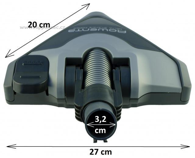Tato hubice je výjimečná - a také vzhledově typická pro vysavače Rowenta - náhradu nenajdete. Delta - tvar trojúhelníku, umožňuje i perfektní vysávání v obtížně přístupných rozích místnosti nebo koutech bez narážení hubice o zeď. Hlava hubice je přepínací - na koberce i tvrdé podlahy, postranní kartáče při vysunutí dokonale vysají í i podlahy pevné Pro docílení "Silence Force" - tedy tichého vysávání při plném výkonu, je třeba tuto hubici kombinovat s originální akustickou trubkou  Měkká kolečka a otočný kloub zvyšují plynulost pohybu hubice . Hubice je vhodná pro všechna kruhové spojení trubic 32/35 mm Tefal, Moulinex, Rowenta - SEB Group.
