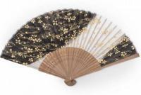 Půvabný originální japonský vějíř bílo / černý, s motivem třešňových květů. Luxusní vzhled, vyrobený dle tradice z bambusového dřeva a hedvábí. Velikost 21 cm. Bez stojánku.