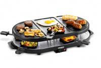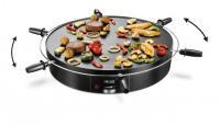 Gril TRISTAR RA 2995 raclette a stolní gril 2v1 je kombinace raclette grilu a grilu stolního dva v jednom. Pečicí ploténka je oboustranná, z jedné strany hladká, z druhé vroubkovaná o rozměru 47 cm x 23 cm. Je z litého hliníku, silná, neprohýbá se a má výborný přenos tepla. Jedna grilovací deska je zcela hladká, vhodná pro přípravu palačinek, vajec, bramboráků, pečiva a druhá vroubkovaná, ideální pro grilování různých druhů masa, ryb, zeleniny, aj. Díky kvalitní nepřipékavé desce můžete grilovat takřka bez nutnosti přidaného tuku, zdravé, dietní pokrmy. Pro 8 osob, 1400 W příkon, 8 pánviček.