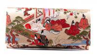 Originální peněženka, která poslouží i jako malá dámská taštička na drobnosti. Působí velmi elegantně. Vnitřní část, podšitá černou látkou, je rozdělena na 3 přihrádky, ze kterých ta uprostřed má zip (na mince). Celková délka peněženky je vhodná pro bankovky. Peněženka je balená v dřevěné dárkové krabičce. Povrch peněženky je z brokátu, se vzorem výjevů ze života na císařském dvoře. Protože jde o ruční výrobu, umístění vzorů látky se může lišit, každý kus je jedinečný. Tkaní brokátu touto technologií bylo pojmenováno podle kjótské čtvrti Nishijin (Nišidžin). Byla to velmi oblíbená textilie pro výrobu oděvů pro císařský dvůj od období Heian. Tato technika tkaní, která vyžaduje hluboké znalosti profese, i nyní udivuje svými úchvatnými designy. Tvorba brokátů Nishijin je uznávané tradiční řemeslo, které patří do kulturního dědictví Japonska.