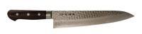 Santoku univerzální nůž :"Tsuchime" Kanetsune nože - to jsou damaškové nože s ultraostrým řezným jádrem z japonské oceli VG-10, excelentně odolné proti korozi. Tento druh japonské oceli se vyznačuje dlouhotrvající ostrostí tvrdosti HRC 59-60. Ocelové jádro je vloženo mezi 17 vrstev nerezové damascénské oceli z obou stran, pro odolnost, pevnost a jistotu řezu. Tsuchime = kladívkový povrch, má nejen luxusní vzhled, ale především je účelný, zabraňuje ulpívání krájených potravin na čepeli nože.