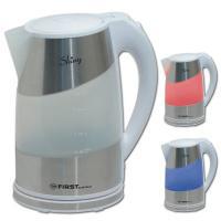 Rychlovarná konvice Shiny od společnosti First Austria. Prostřední část mění barvu dle teploty vody - modrá, bílá, červená. Konvice je v bílé barvě, s nerezovými akcenty. Obsah 1,7 litru, skrytá spirála, 360 st. otočná, 2200W, třístupňové jištění.
