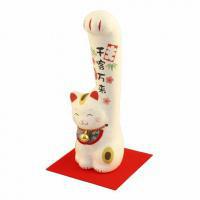Tato jedinečná kočka štěstí - Maneki Neko zve dobré lidi nebo zákazníky, a ruku má velmi dlouhou, aby byla vidět široko, daleko. Maneki Neko s dlouhou ruku jsou se nazývají Tenaganeko a v Japonsku se traduje, že čím je ruka delší, tím více přitahuje štěstí a navazování nových přátelských vztahů. S rolničkou na krku a textilní podložkou.