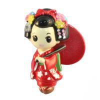 Ozdobná magnetka - např. na chladničku - s motivem japonské panenky Kokeshi s červeným deštníkem a červeným kimonem. „Maiko" je japonský výraz pro ženu, která se chce stát gejšou.