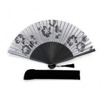 Půvabný japonský vějíř, zdobený černými květinami na stříbrno-bílém pozadí, představuje rafinovaný doplněk pro společenské události, jako jsou plesy, divadelní představení, svatby či letní slavnosti. Kromě toho je součástí vějíře elegantní černé pouzdro pro jeho bezpečné uložení, a vše je pečlivě zabaleno v dárkové krabičce.