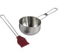 Nádoba z nerezové oceli, určená na potírání grilovaných pokrmů marinádou, pohodlné držení díky dlouhé rukojeti misky a mašlovačky, rukojeť nádoby a mašlovačky umožňuje zavěšení.