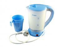 Cestovní rychlovarná konvice First FA 5425-2 W v bílé barvě. Konvice má obsah 0,5 litru, skrytou topnou spirálu a světelnou kontrolku provozu. Na spodní části konvice jsou protiskluzové zábrany. Součástí balení jsou dva plastové hrníčky v bílé barvě. Vypnutí je automatické, na transparetní části konvice je ukazatel hladiny vody.