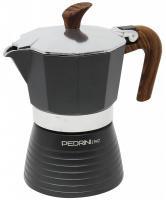 Hliníková moka konvice na 3 šálky kávy - 150 ml, ve speciálním designu "Oslava" k 75 letům založení společnosti Pedrini - kombinace imitace dřevěné rukojeti a černé barvy. Přetlakový kávovar (někdy se také nazývá perkolátor) pro tradiční přípravu italské kávy s vynikajícím aroma a jedinečnou chutí je vyrobený ze zdravotně nezávadného aluminia a je určený pro elektrické, sklokeramické a plynové ploténky- tedy pro všechny, s výjimkou indukce. Moka konvička Pedrini má ergonomickou rukojeť s a knoflík na víku z horkuodolného plastu (max 210 ° C) , bezpečnostní přetlakový ventil a povrch s úpravou pro snadnou údržbu - vše, co potřebujete pro přípravu výborné kávy, kterou s ním připravíte snadno a osvědčeným způsobem, který se po léta nezměnil.
