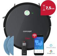 Robotický vysavač s mopem 2v1 Concept VR3000 umí vysávat i vytírat, navíc s jeho výškou 7,5 cm se snadno dostane pod jakýkoliv nábytek. Je velmi tichý, v provozu vydrží až 150 min. Poradí si s každým povrchem, výjimkou není ani koberec s vlasem vysokým až 1,5 cm. Nádoba na vysávání má objem 600 ml. Turbo kartáč vysavače uklidí nejen chlupy, ale i jemný prach, s bočními kartáčky vysaje i rohy místnosti. V případě, že si přejete podlahu vytřít, vyměníte prachovou nádobu za nádobu na vodu a nasadíte textilii na vytírání. Robot si vodu automaticky dávkuje. Čistící textilii lze prát v pračce. Vysavač je možné ovládat přes aplikaci We Back, která je zdarma dostupná pro iOS a Android.
