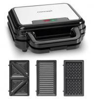 Připravit rychlou snídani, svačinu či večeři umožní multifunkční sendvičovač 3v1 Concept SV3060. Dostali jste chuť na křupavé tousty, vafle nebo grilované pochoutky? To vše lze připravit díky třem vyměnitelným deskám, stačí si jen vybrat podle toho, na co jste právě dostali chuť. Vyměnitelné desky mají nepřilnavý povrch, díky kterému se pokrmy nepřipalují a jejich údržba je velmi rychlá a snadná. Desky se velice snadno oddělují od samotného tělesa sendvičovače, po vychladnutí je vložíte do myčky nebo otřete vlhkým hadříkem či papírovým ubrouskem.