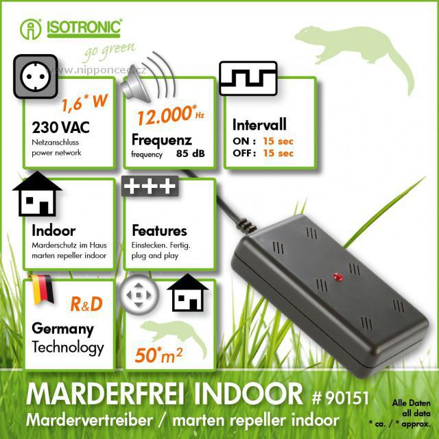 Isotronic Marten Free Plašič kun vnitřní, s provozem na baterie, do bytu, domu, na půdu, do auta, či garáže. Chrání kabely, drátky a apod. před poškozením od kuních zubů a interiér před znečistěním od kun. Provoz na 4xLR14 - malé monočlánky. S touto jednou sadou baterie vydrží přístroj v provozu cca. 6 měsíců. Plašič kun vydává zvuky s vysokým kmitočtem, které trvají cca 60 vteřin, při 60ti sekundových intervalech.Tyto zvuky jsou pro lidské ucho takřka nepostřehnutelné, ale kuny obtěžují natolik, že je donutí vyklidit teritorium. Zvuk plašiče sice jiným živočichům neublíží, ale může být nepříjemný i kočce či psovi, není tedy vhodné přístroj umístit do jejich přímé blízkosti.