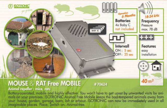 Rozčilují vás nezvaní hosté v podobě myší, krys nebo hmyzu? Pak inovativní, bateriový, mobilní a vysoce účinný odpuzovač od společnosti Isotronic vás před těmito škůdci ochrání. Přístroj udržuje nezvané hosty mimo váš dům, zahradu, garáž, stodolu, podkroví nebo altánu. Je okamžitě připravený k použití a navíc není nutné žádné další napájecí připojení ani montáž. S integrovaným 30 sekundovým přepínáním, Oszi-technologií, zabraňuje škůdcům navyknout si na zvuk. Navíc může být přišroubován ke zdi ve stodole nebo stáji a je tedy možné ho použít kdekoliv v interiéru, kde je ho potřeba. Technologie odpuzování je založena na generování ultrazvukových vln, které odpuzují škůdce a přitom jsou člověku neškodné. Součástí přístroje je piezoelectric transducer, což je silný a odolný ultrasonický generátor, který mění energii na ultrazvukové vlny. Disponuje přepínačem ON-OFF pro šetření energie a případné úplné vypnutí.
