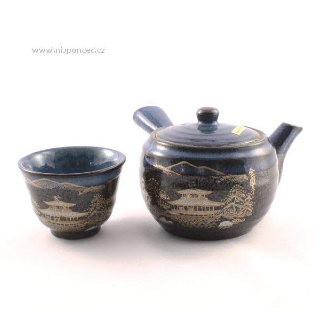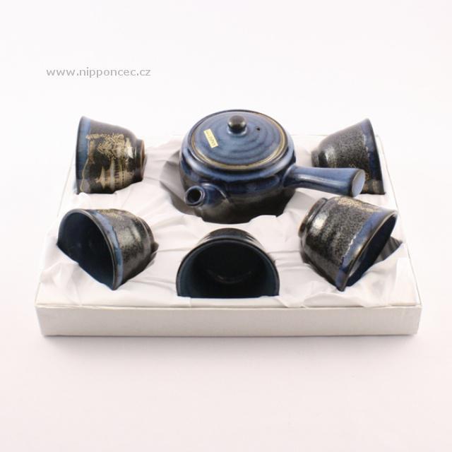 Originální japonská čajová souprava Kuronagashi - v překladu "Černý proud" se skládá z konvičky a pěti šálků, vyrobena je z keramiky s černo-tmavě modrou glazurou. Na konvici i na čajových šálcích je znázorněný zlatý pavilon Kinkakuji - světově proslulá historická památka v Kjótu.