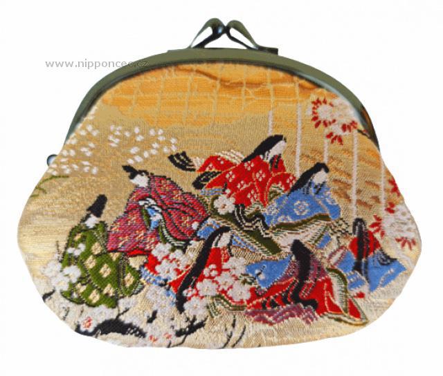 Originální peněženka, která poslouží i jako malá dámská taštička na drobnosti. Působí velmi elegantně. Vnitřní část, podšitá černou látkou, je rozdělena na 3 přihrádky, ze kterých ta uprostřed má zip (na mince). Celková délka peněženky je vhodná pro bankovky. Peněženka je balená v dřevěné dárkové krabičce. Povrch peněženky je z brokátu, se vzorem výjevů ze života na císařském dvoře. Protože jde o ruční výrobu, umístění vzorů látky se může lišit, každý kus je jedinečný. Tkaní brokátu touto technologií bylo pojmenováno podle kjótské čtvrti Nishijin (Nišidžin). Byla to velmi oblíbená textilie pro výrobu oděvů pro císařský dvůj od období Heian. Tato technika tkaní, která vyžaduje hluboké znalosti profese, i nyní udivuje svými úchvatnými designy. Tvorba brokátů Nishijin je uznávané tradiční řemeslo, které patří do kulturního dědictví Japonska.