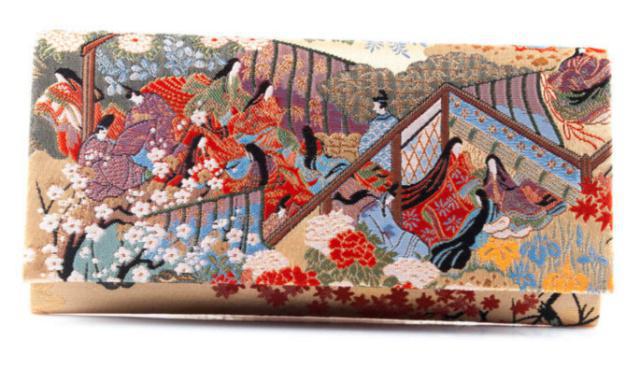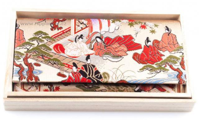 Povrch peněženky je z brokátu, se vzorem výjevů ze života na císařském dvoře. Protože jde o ruční výrobu, umístění vzorů látky se může lišit, každý kus je jedinečný.