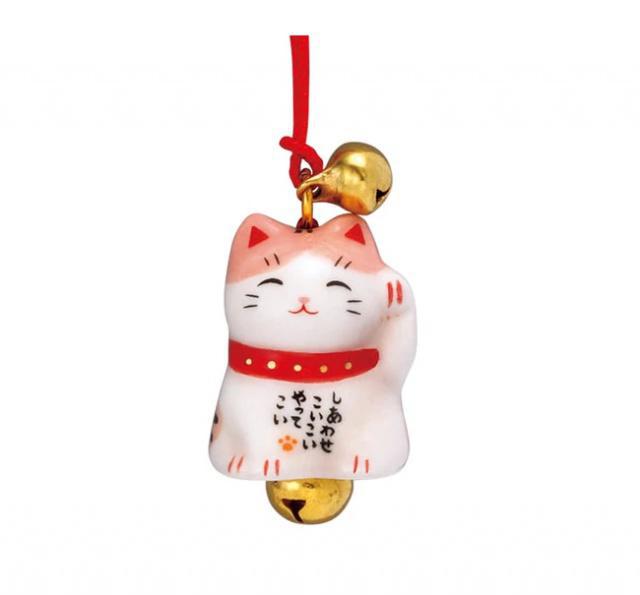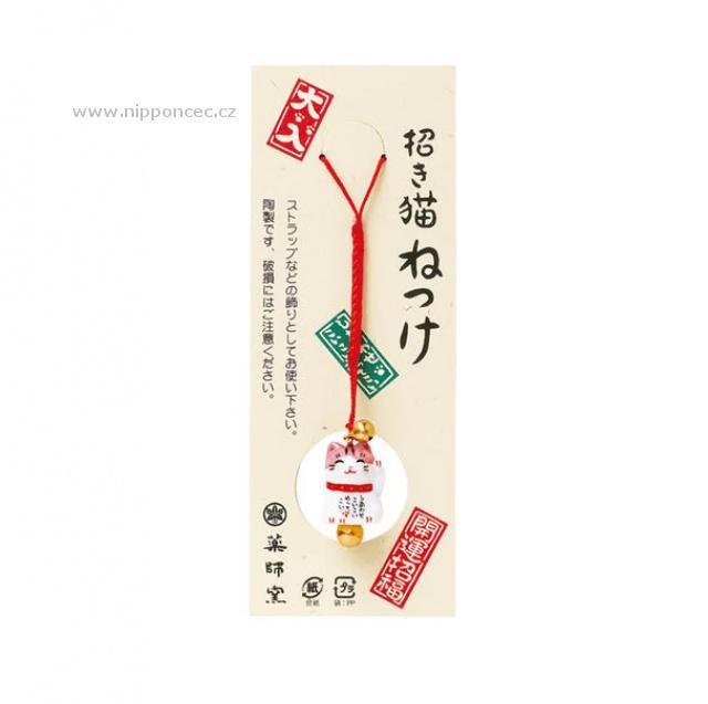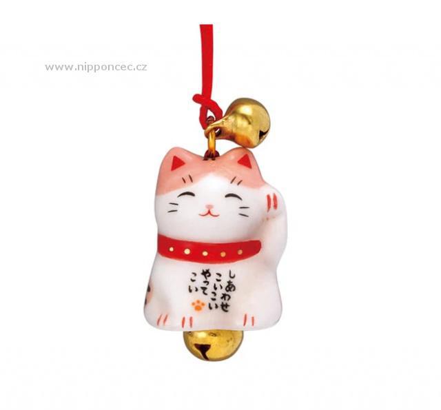 Japonská kočička Maneki Neko se zvednutou pravou tlapkou Vám podle legend přivolá peníze do peněženky a štěstí do života. V přívěsku je malý zvonek, jehož jemný zvuk připomíná zvonkohru.