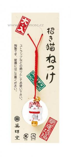 Japonská kočka Maneki Neko na mobil 2,8 cm, bílá/růžová