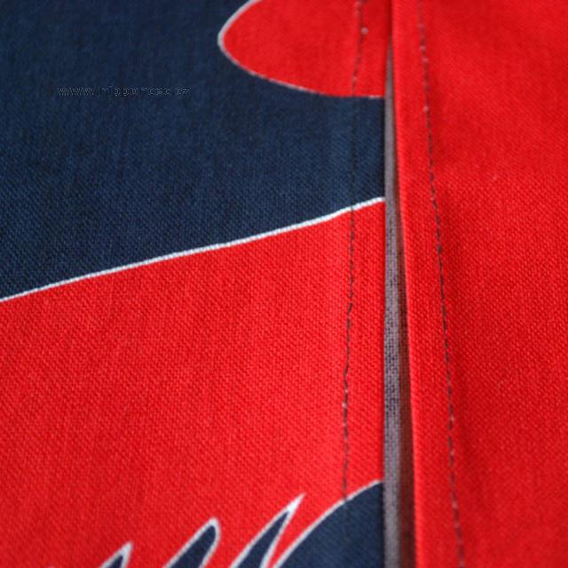 Látková stěna Noren s červeně vyobrazenou slabikou YU, která je součástí japonské abecedy hiragany.