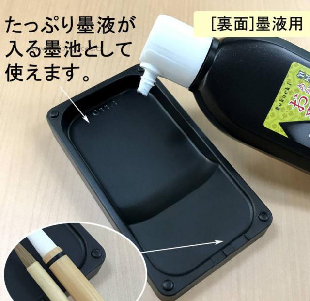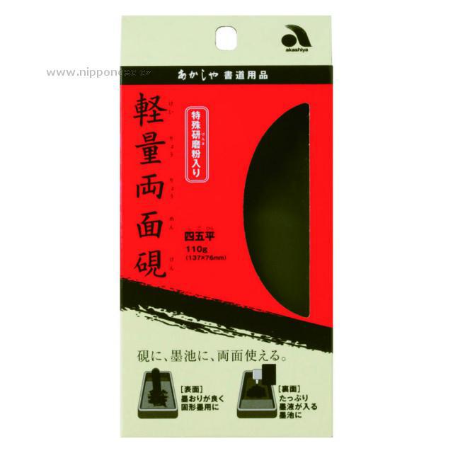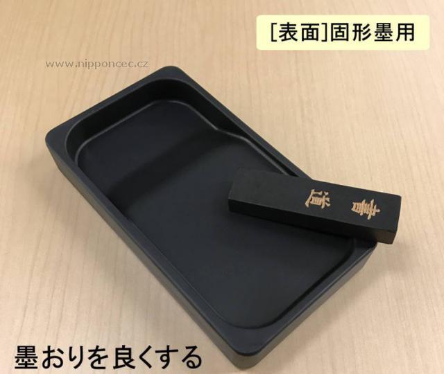 Kvalitní třecí kámen a a zároveň nádoba na tuš. Proces rozpouštění tuše je tradiční meditativní proces. Pomalým přidáváním kapek vody na kámen na rovnou část a třením tuše dosáhnete požadovaného odstínu a hustoty. Tato část se nazývá riku - planina. Tekutá tuš stéká do žlábku, který má název umi - moře. Spolu se savým japonským rýžovým papírem, štětcem a tuhou tuší tvoří třecí kámen tzv. "čtyři poklady kaligrafie".