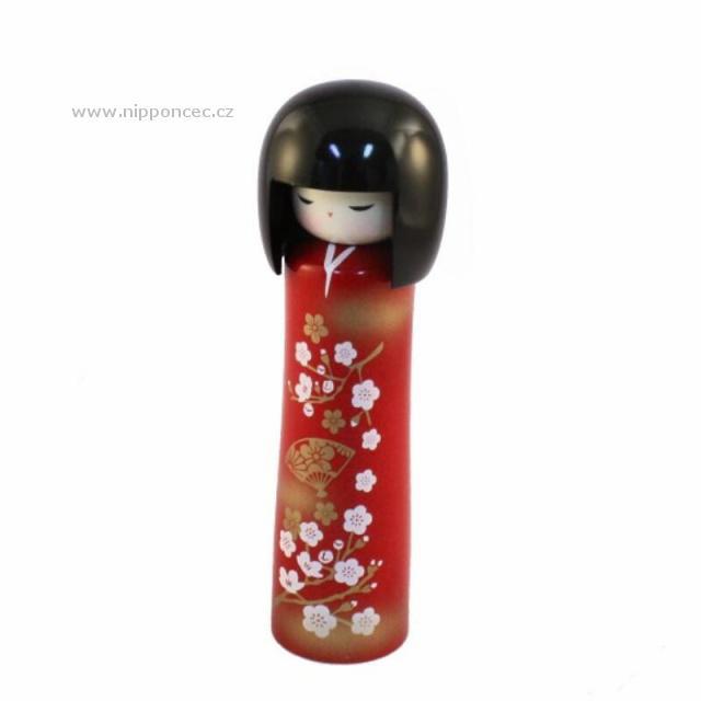 Elegantní japonská panenka Hana - Kokeshi Ume je vysoká 19 cm a její kimono v červené barvě je dekorované malbou švestkových květů. Figurka pochází z dílny mistra řezbáře Gono.