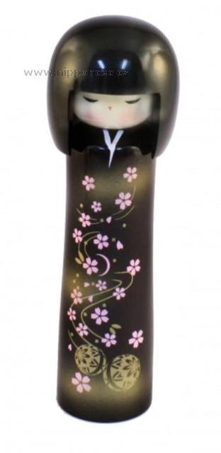 Elegantní japonská panenka Hana Kokeshi Sakura je vysoká 19 cm a její kimono v černé barvě je dekorované malbou květů sakury. Figurka pochází z dílny mistra Gono.