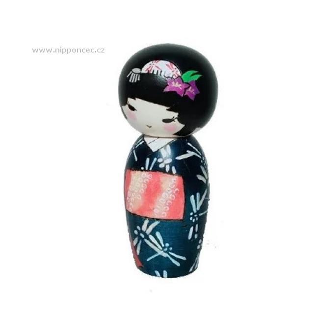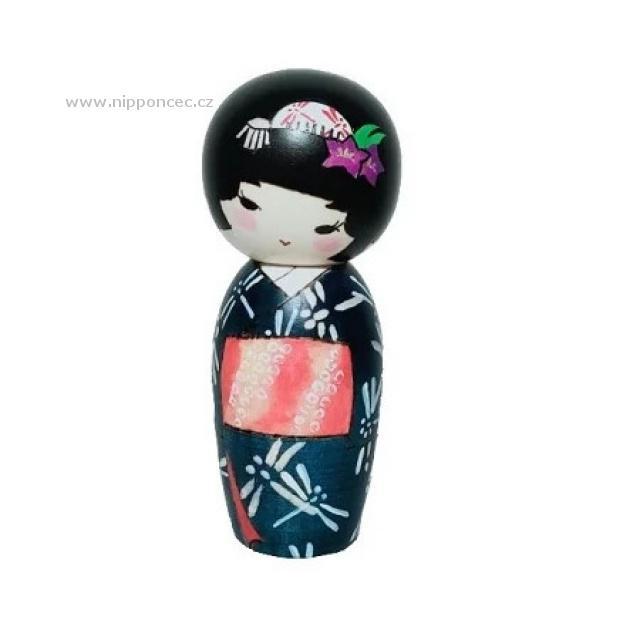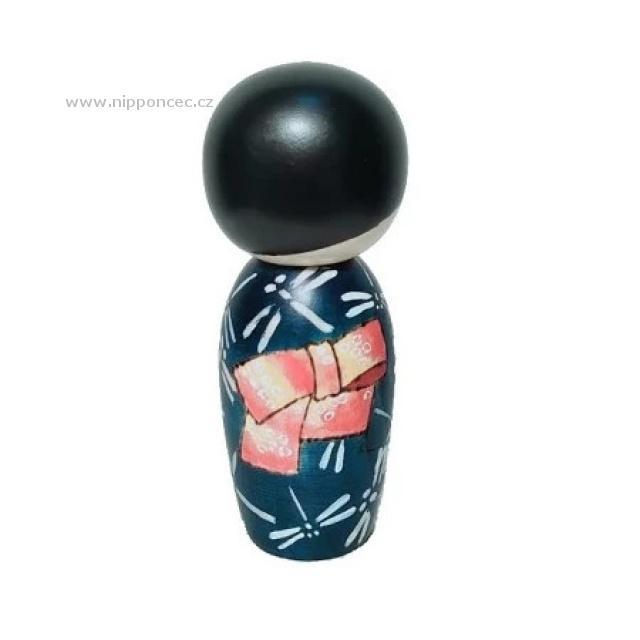 Kouzelná japonská panenka Kokeshi „Akikaze“ (podzimní vánek) je oděna do tmavomodrého kimona zdobeného jemným motivem vážek. Vlasy jí zdobí tradiční ozdobná jehlice, podtrhující její ladný vzhled. Tato jedinečná Kokeshi s podzimní atmosférou pochází z dílny mistra Izumi a je krásným symbolem elegance, klidu a japonského řemeslného umění.