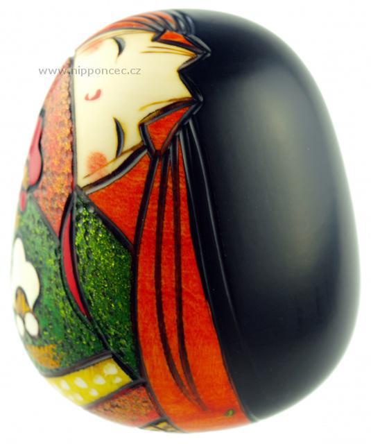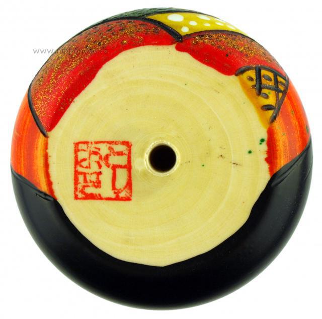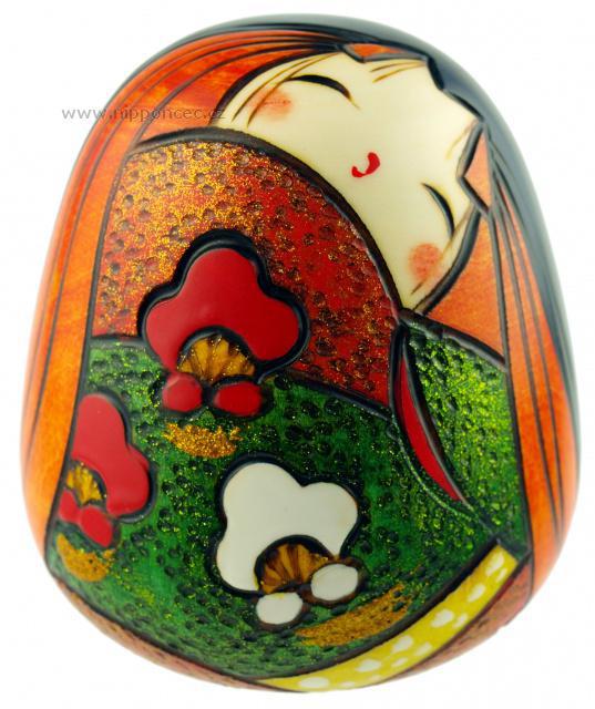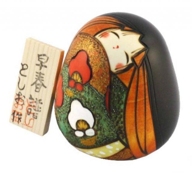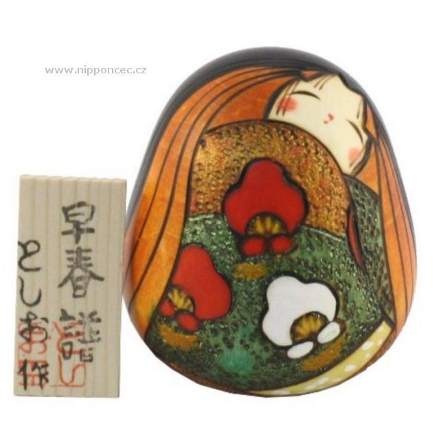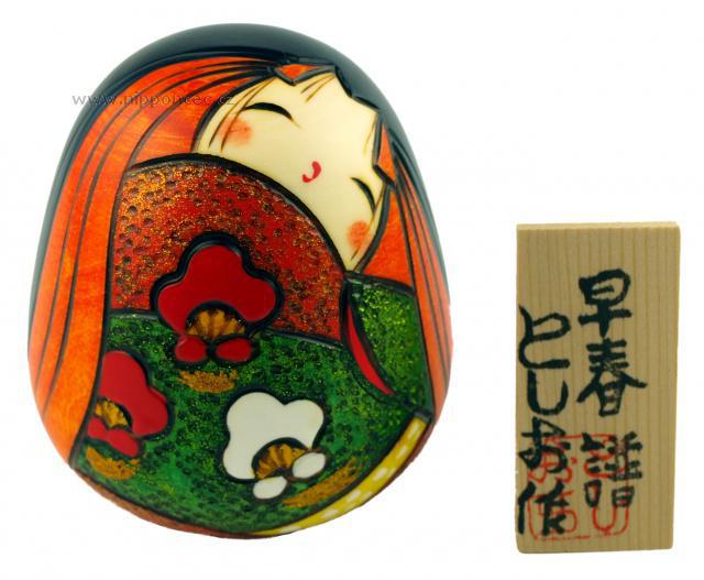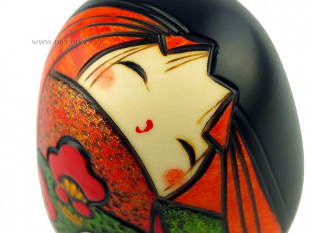 Kokeshi panenka se jménem Soushunfu je oválného tvaru - 9 cm výška - představuje nový design Kokeshi panenek z dílny japonského mistra Toshia Sekiguchi. Je jedinečná, měkce kulatých tvarů, zahalená v temně zeleném kimonu s rudými a bílými kvítky a vodopádem rudých vlasů. Panenka Kokeshi je vynikajícím dárkem jako projev lásky a přátelství pro vaše blízké.
