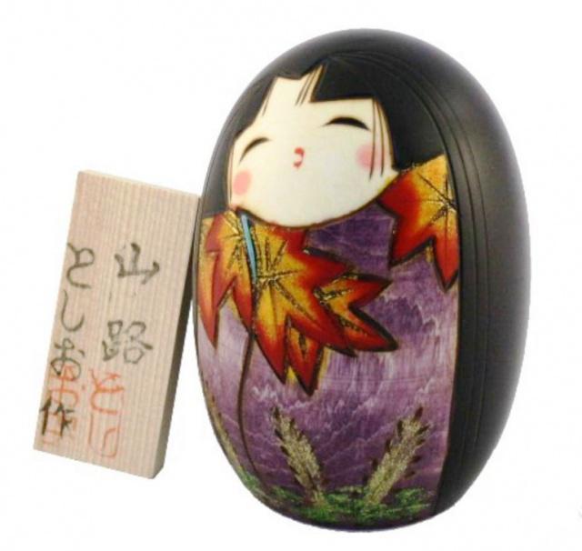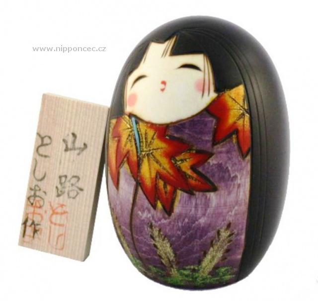 Kokeshi panenka se jménem Yamaji je oválného tvaru - 12 cm výška - představuje nový design Kokeshi panenek z dílny japonského mistra Toshio Sekiguchi. Je zachumlaná do fialového kimona zdobeného malovanými listy japonského javoru v zářivých podzimních barvách. Panenka Kokeshi je vynikajícím dárkem jako projev lásky a přátelství pro vaše blízké.