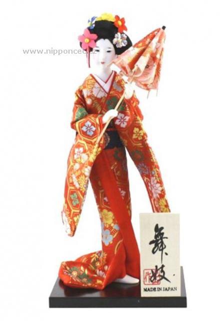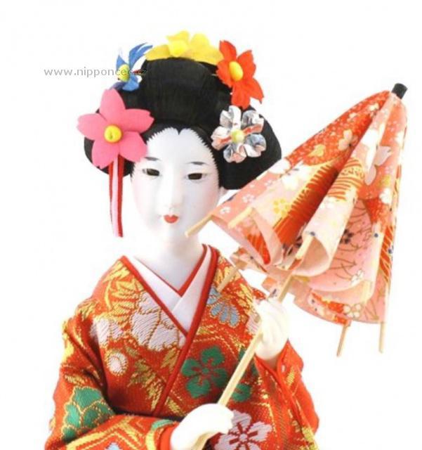Japonská panenka - Gejša Maiko je oděná do půvabného tradičního kimona z hedvábí, které je převázané překrásným páskem zvaným obi. Stojí na dřevěném podstavci a v ruce drží slunečník. Jedná se o ručně vyrobenou a malovanou panenku, která se může stát i sběratelským kouskem. Ruce i obličej jsou z umělé pryskyřice. Je vyrobena v Japonsku.