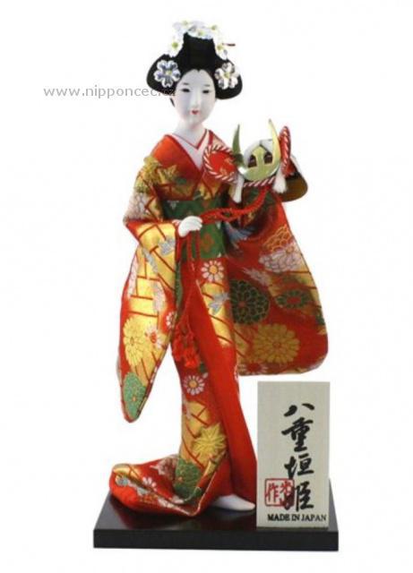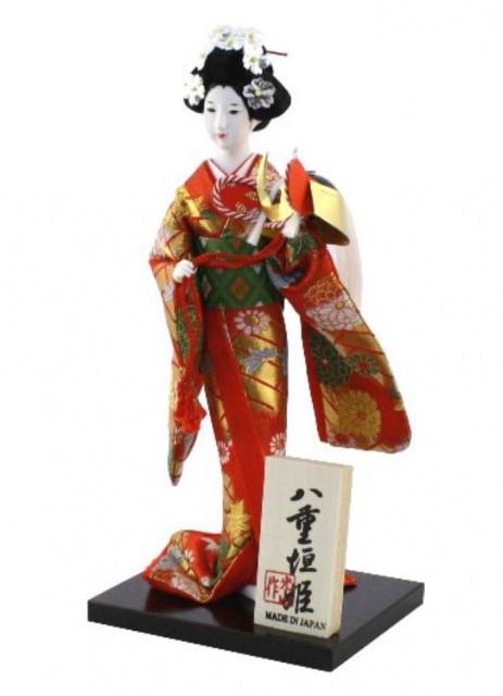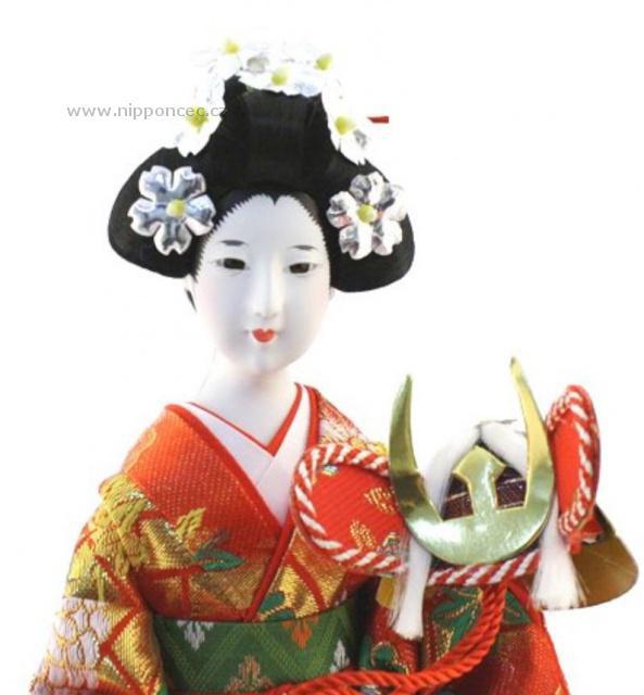Japonská panenka - Gejša Yaegaki oděná do půvabného tradičního kimona z hedvábí, které je převázané překrásným olivově šedým páskem zvaným obi. Stojí na dřevěném podstavci a v ruce drží samurajské Kabuto. Kabuto je druh přilby používané starodávnými japonskými válečníky, které se v pozdější době staly součástí samurajského zbroje. Jedná se o ručně vyrobenou panenku, která se může stát i sběratelským kouskem. Je vyrobena v Japonsku.