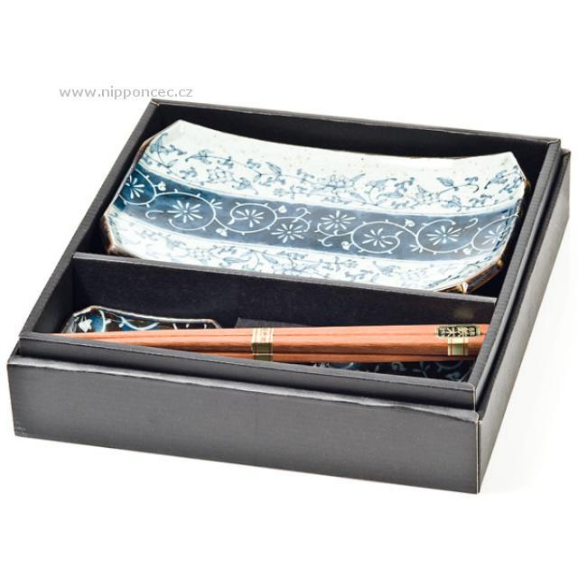 Porcelánová jídelní sada Konan Set se skládá z talíře, dvou misek a dvou párů dřevěných jídelních hůlek. Dodáváme v elegantní černé dárkové krabičce.