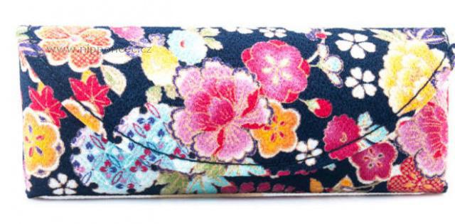 Dámské pouzdro na brýle je široké 16 cm. Pouzdro je potažené kimono látkou pestrého vzoru, s magnetickým uzávěrem. Vnitřní část je černá - sametově měkká, a vytvarovaná tak, aby bylo zabráněno nechtěnému posunutí brýlí v pouzdře. Praktický a elegantní doplněk, který svou krásou a příjemným dotykem potěší každou ženu.