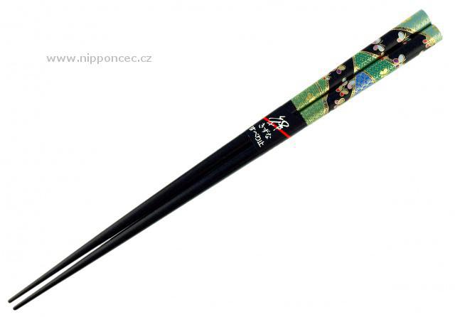 Lakované japonské jídelní hůlky v zelené barvě s moderním motivem květů "haši". Konečky těchto japonských hůlek jsou v porovnání s hůlkami čínskými užší, což zjednodušuje uchopení sousta.