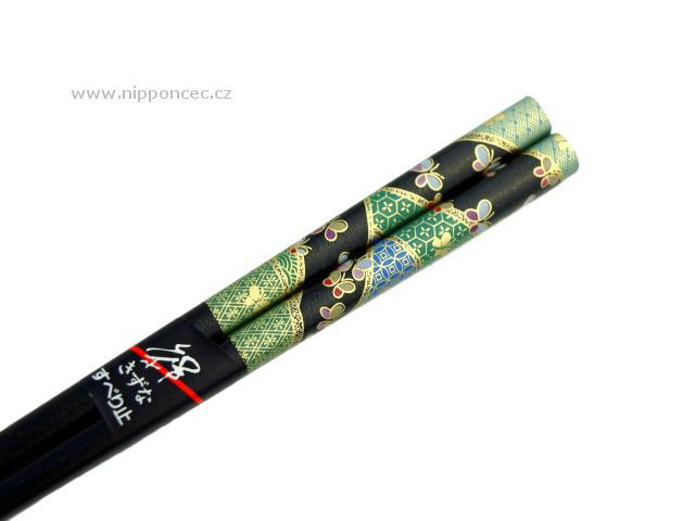Lakované japonskéjídelní hůlky z tmavého dřeva s moderním motivem motýlů "haši". Konečky těchto japonských hůlek jsou v porovnání s hůlkami čínskými užší, což zjednodušuje uchopení sousta.