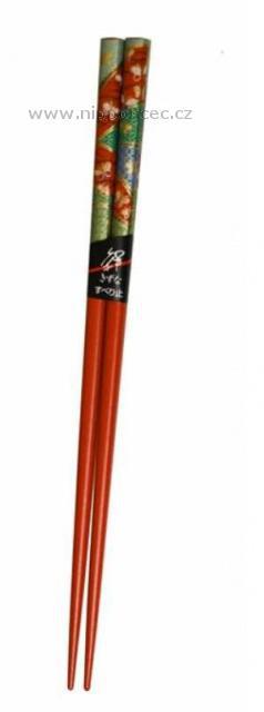 Lakované japonské jídelní hůlky v červené barvě s moderním motivem květů "haši". Konečky těchto japonských hůlek jsou v porovnání s hůlkami čínskými užší, což zjednodušuje uchopení sousta.