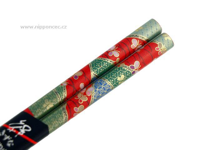 Lakované japonskéjídelní hůlky ze dřeva s moderním motivem motýlů "haši". Konečky těchto japonských hůlek jsou v porovnání s hůlkami čínskými užší, což zjednodušuje uchopení sousta.