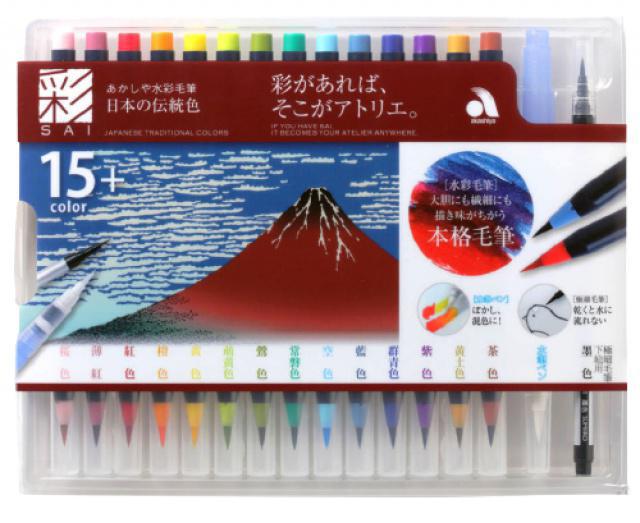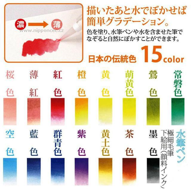 Barvy - tradiční barevné japonské odstíny: třešňový květ, světlečervená, tmavočervená, oranžová, žlutá, žlutozelená, hnědozelená, věčná zeleň, azurová, indigo, ultramarín, fialová, ekru, hnědá plus štětcové pero plnitelné vodou a černé obrysové štětcové pero ThinLine, odolné vůči vodě a vyblednutí.